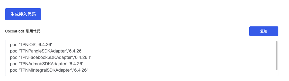 请点击这里前往SDK下载中心,勾选需要集成的平台,是否Cocoapods接入选择:是,然后点击生成接入代码。(以iOS 6.4.26为例,推荐使用最新版本的iOS SDK)