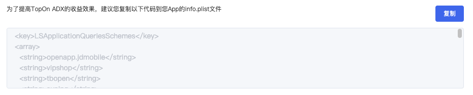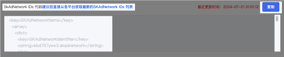 请您回到上文中打开的"SDK下载中心"网页,将"SKAdNetwork IDs代码"栏目中所列出的内容添加至您的Info.plist文件中,请参考下图: